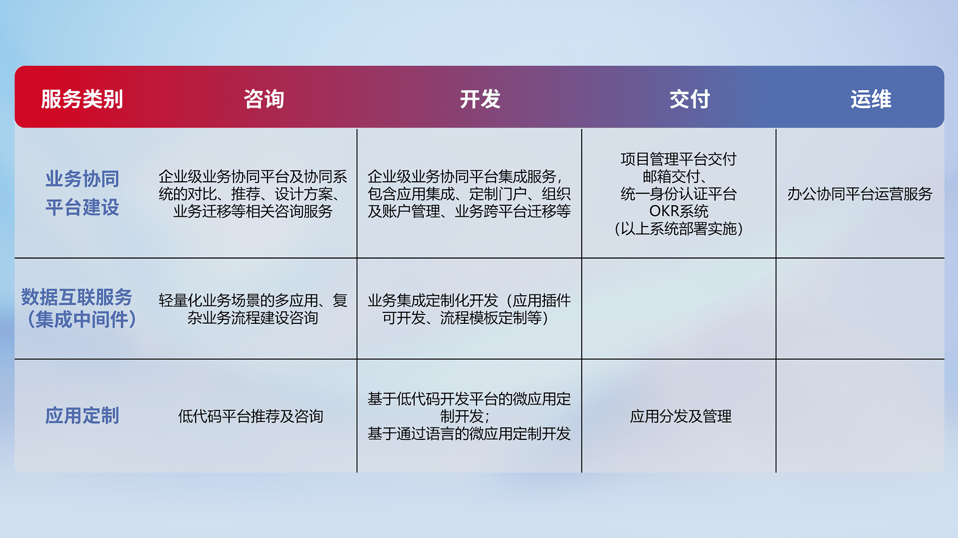 针对钉钉、、、企微、、IDaas等平台级产品提供产品的规划、、、方案、、交付、、定制化开发等服务,,,,实现如统一协同办公、、、智能客户服务、、混合会议管理、、、、智能数据查询、、、等业务场景,,,,实现数字化转型。。